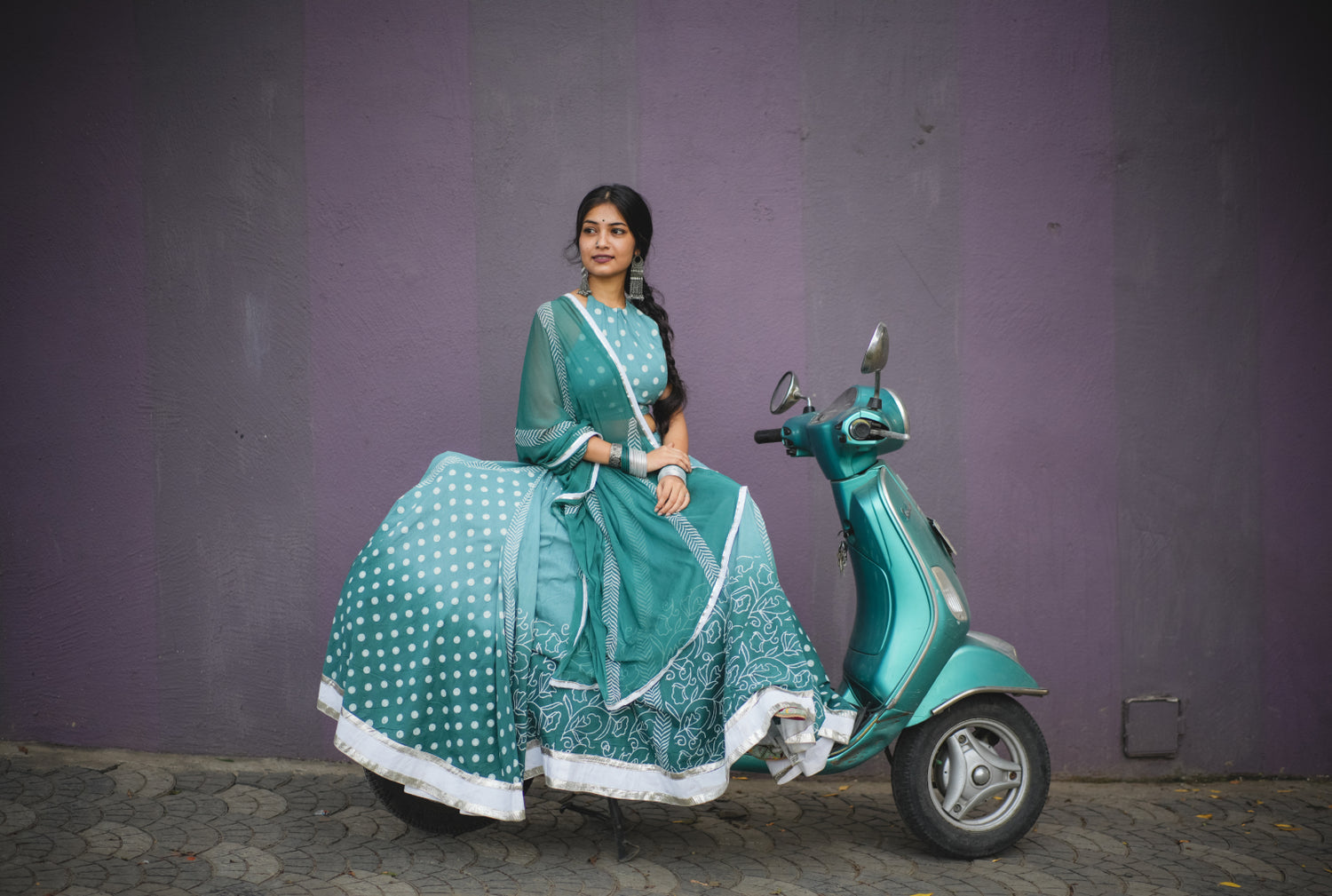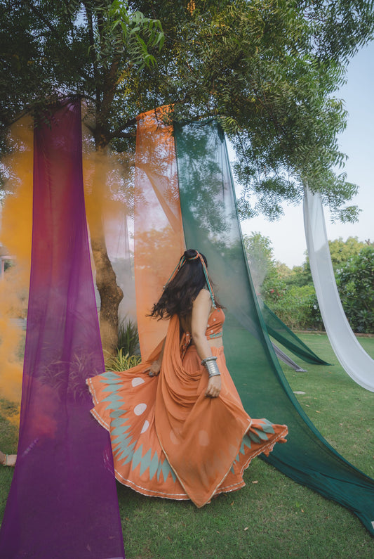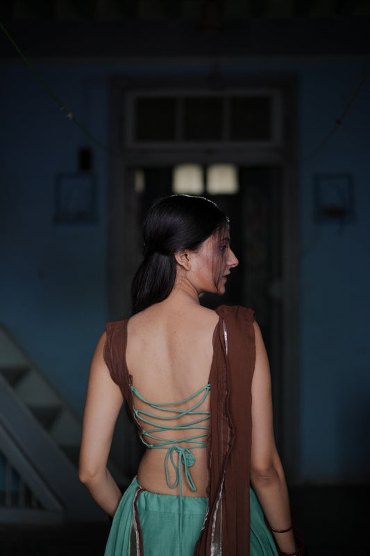 Sea Green & Brown Hand Block Printed Lehenga Set