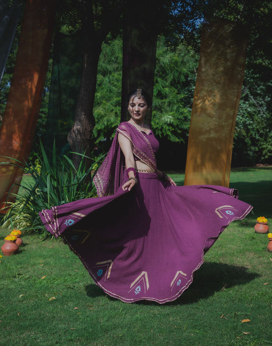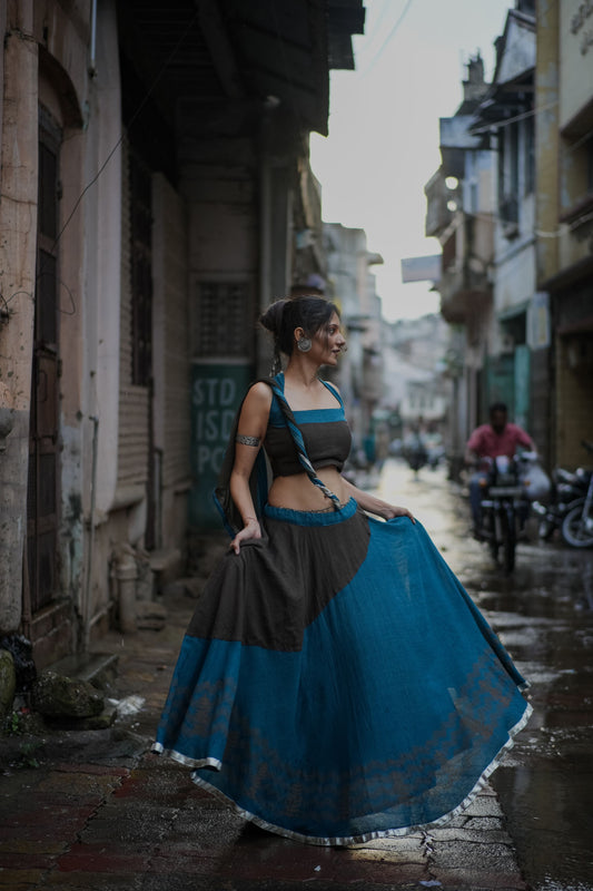 Sherpa Blue & Dark Brown Hand Block Printed Lehenga Set With Shaded Dupatta