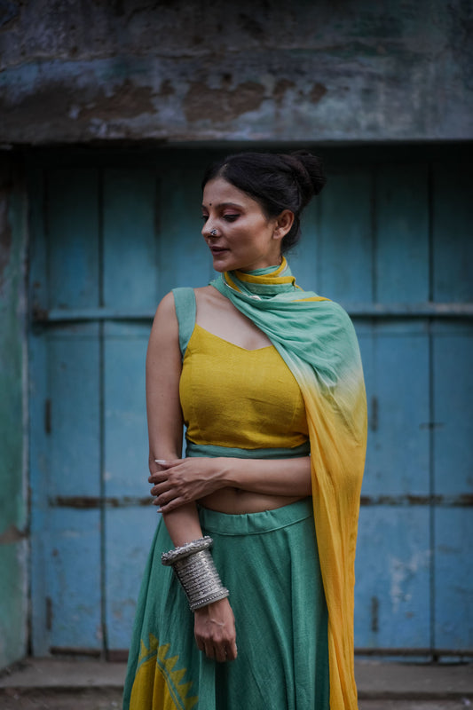 Pale Yellow & Sea Green Hand Block Printed Lehenga Set