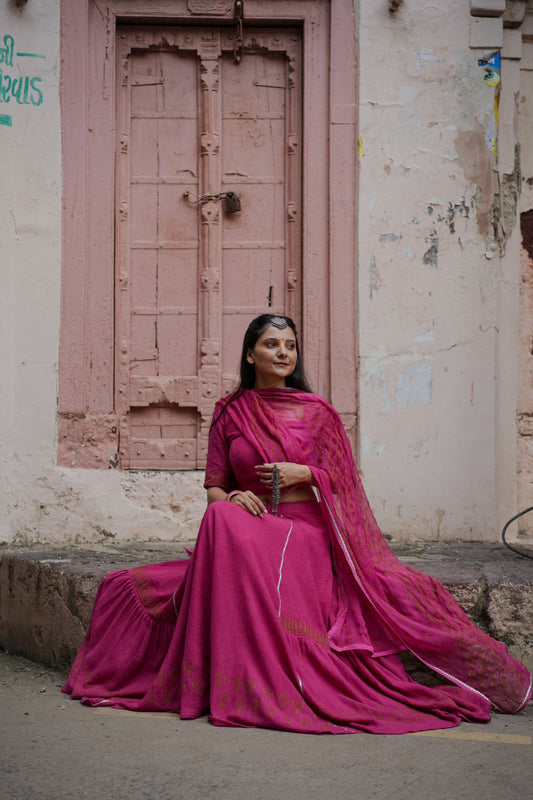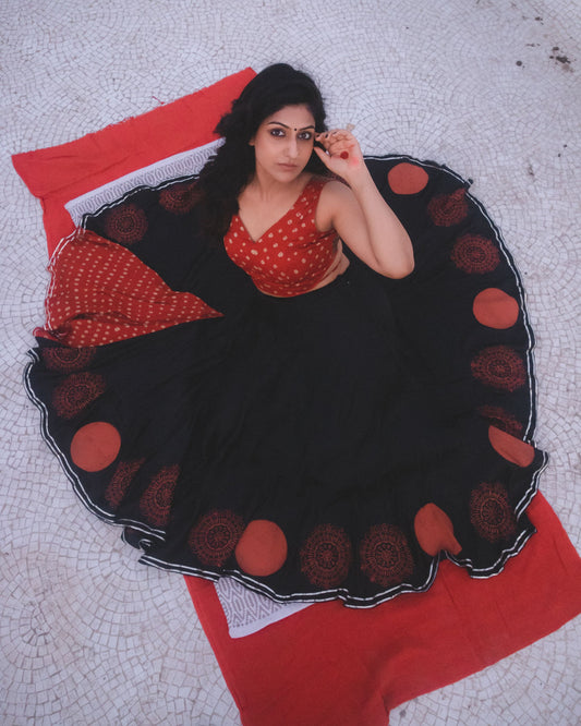 Vintage Red & Black Hand Block Printed Silk Lehenga Set