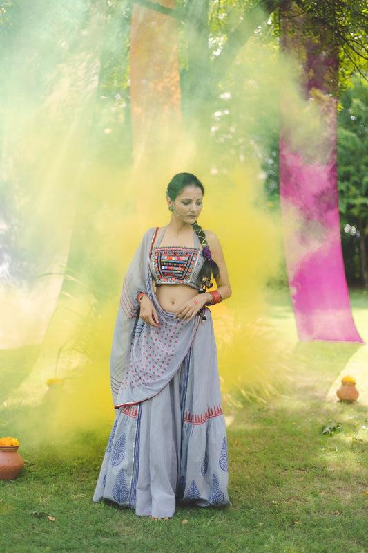 Grey Hand Block Printed Lehenga Set With Kutchhi Gamthi Work